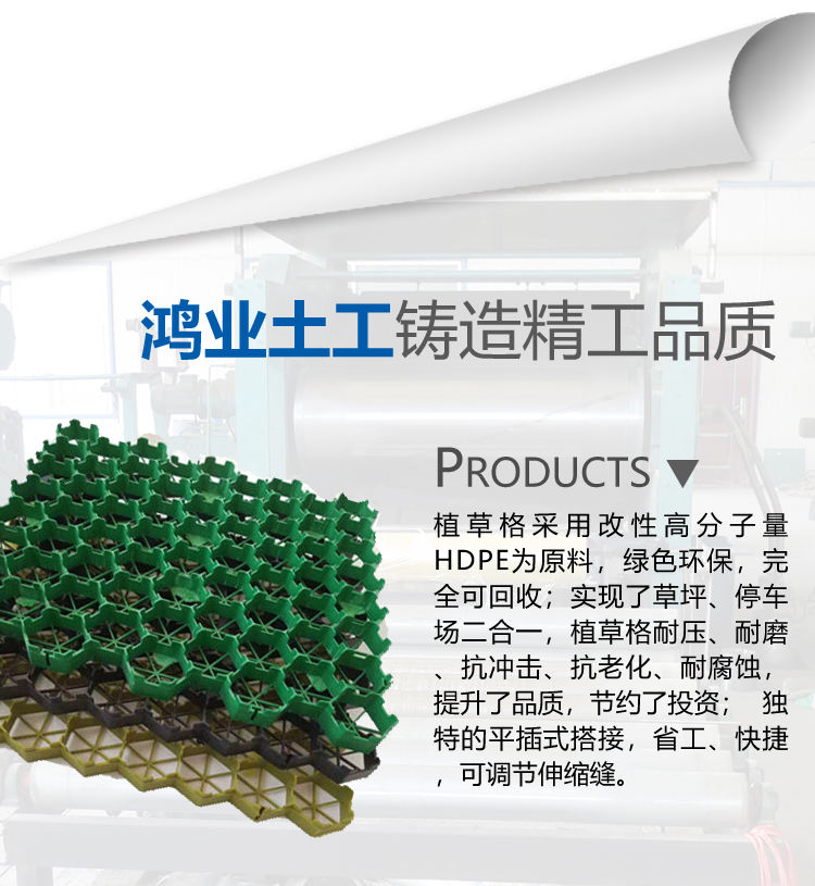 植草格采用改性高分子量HDPE為原料,綠色環(huán)保,可回收;實現(xiàn)了草坪、停車場二合一,植草格耐壓、耐磨、抗沖擊、抗老化、耐腐蝕,提升了品質,節(jié)約了投資; 獨特的平插式搭接,省工、快捷,可調節(jié)伸縮縫。