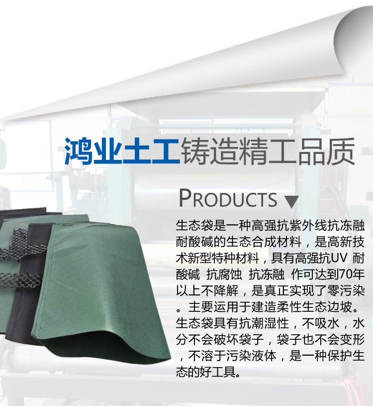 生態(tài)袋是一種高強(qiáng)抗紫外線抗凍融耐酸堿的生態(tài)合成材料,是高新技術(shù)新型特種材料,具有高強(qiáng)抗UV 耐酸堿 抗腐蝕 抗凍融 作可達(dá)到70年以上不降解,是真正實(shí)現(xiàn)了零污染。主要運(yùn)用于建造柔性生態(tài)邊坡。生態(tài)袋具有抗潮濕性,不吸水,水分不會破壞袋子,袋子也不會變形,不溶于污染液體,是一種保護(hù)生態(tài)的好工具。