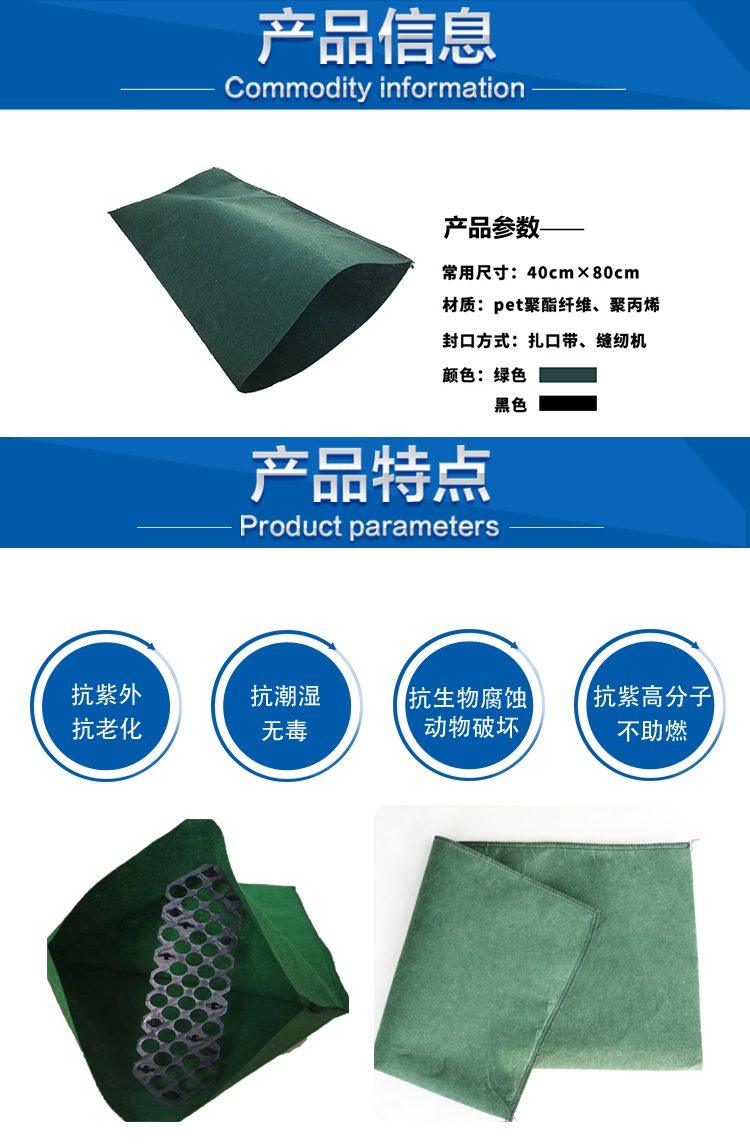 由聚丙烯(PP)或者聚酯纖維(PET)為原材料制成的雙面熨燙針刺無紡布加工而成的袋子。對抗紫外生態(tài)袋的厚度、單位質(zhì)量、物理力學(xué)性能、外形、纖維類型、受力方式、方向、幾何尺寸和透水性能及滿足植物生長的等效孔徑等指標(biāo)進(jìn)行了嚴(yán)格的篩選,具有抗紫外(UV),抗老化、無毒,不助燃,裂口不延伸的特點(diǎn),真正實(shí)現(xiàn)了零污染。主要運(yùn)用于建造柔性生態(tài)邊坡。生態(tài)袋邊坡防護(hù)綠化,是荒山、礦山修復(fù)、高速公路邊坡綠化、河岸護(hù)坡,內(nèi)河整治中重要的施工方法之一。