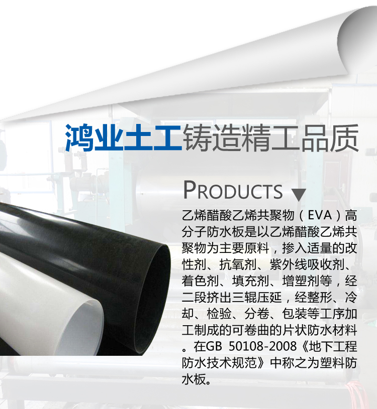 乙烯醋酸乙烯共聚物(EVA)高分子防水板是以乙烯醋酸乙烯共聚物為主要原料,摻入適量的改性劑、抗氧劑、紫外線吸收劑、著色劑、填充劑、增塑劑等,經(jīng)二段擠出三輥壓延,經(jīng)整形、冷卻、檢驗(yàn)、分卷、包裝等工序加工制成的可卷曲的片狀防水材料。在GB 50108-2008《地下工程防水技術(shù)規(guī)范》中稱之為塑料防水板。與PE相比,EVA由于分子鏈上引入醋酸乙烯(VA)單體,從而降低了結(jié)晶度,提高了柔韌性、耐沖擊性、與填料相容性和熱密封性,并具有較好的耐環(huán)境應(yīng)力開(kāi)裂性,良好的光學(xué)性能、抗化學(xué)腐蝕等優(yōu)點(diǎn),且無(wú)毒、不吸水。施工工藝簡(jiǎn)單,可操作性好,可修補(bǔ)性強(qiáng)。對(duì)施工環(huán)境要求低,特別適用于隧道、管道等狹小空間及通風(fēng)條件差和有滲透水的環(huán)境施工。